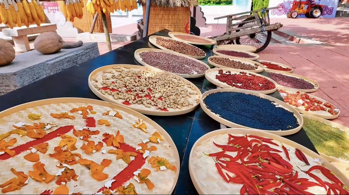 秋日的石门坊,一场与众不同的“丰收美学”正在上演。百年核桃树下,玉米、辣椒、谷物拼组成巨大的丰收图腾;东方红拖拉机、小推车、怀旧唱片机重现8090年代潮流场景——这不是传统的民俗节庆,而是一场融合农耕文化与现代创意的“新农潮”盛宴。