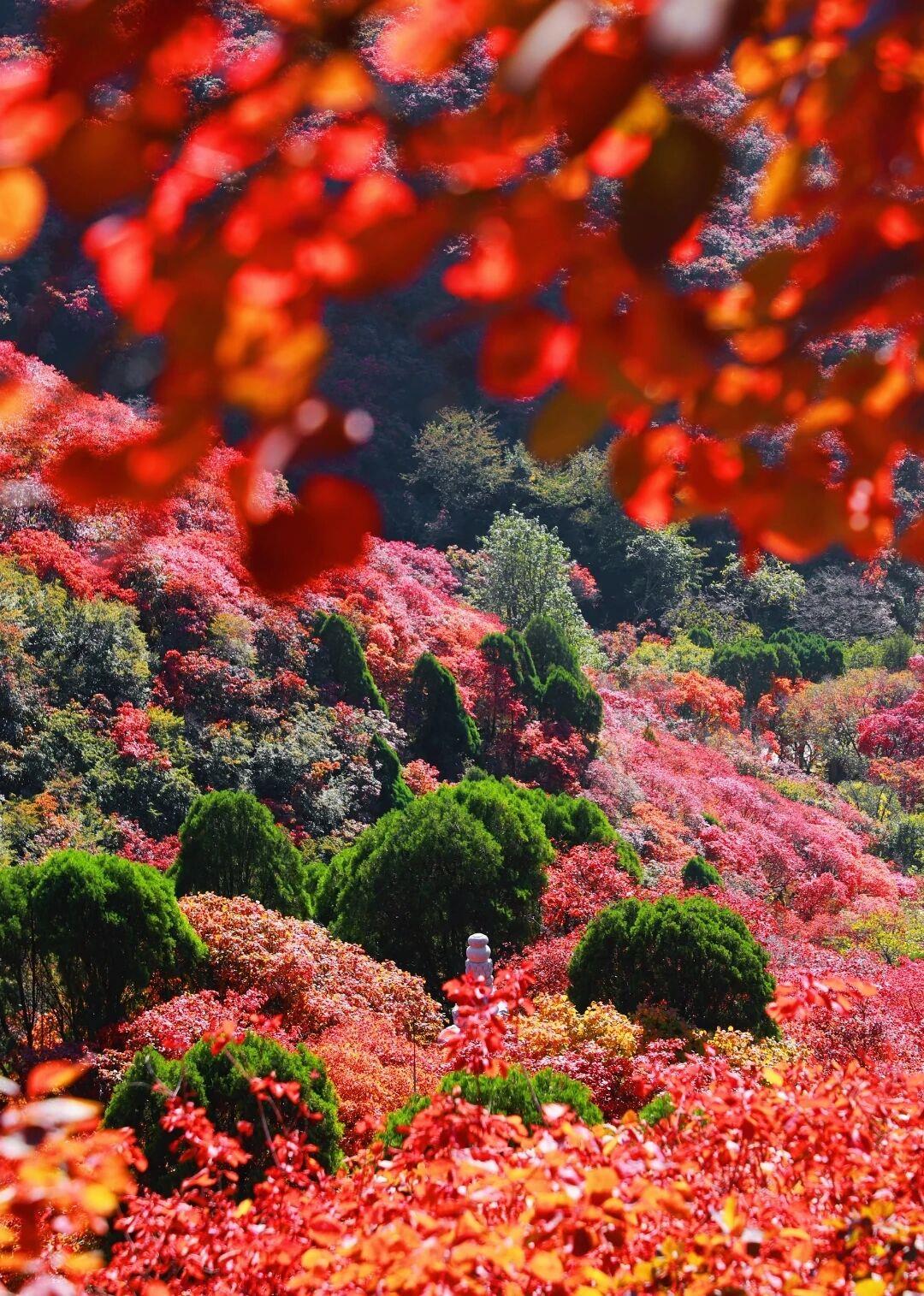 本届红叶节突破传统观赏模式,创新构建“红叶+”体验体系。景区不仅优化了中线宣德塔、玻璃观景台等经典观景动线,更打造了红叶照相馆、红叶唱片机、佛手拈花等系列网红打卡点,配套专业拍摄指导服务,显著提升游客参与度与传播价值。