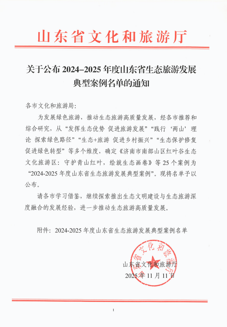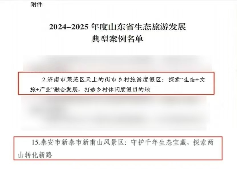 近日,“生态山东 绿色休闲”2025山东生态旅游推进活动在济南市莱芜区成功举办。在活动现场,省文化和旅游厅公布了2024-2025年度山东省生态旅游发展典型案例名单,山东文旅集团济南天上的街市乡村旅游度假区和新泰新甫山景区两项目入选。