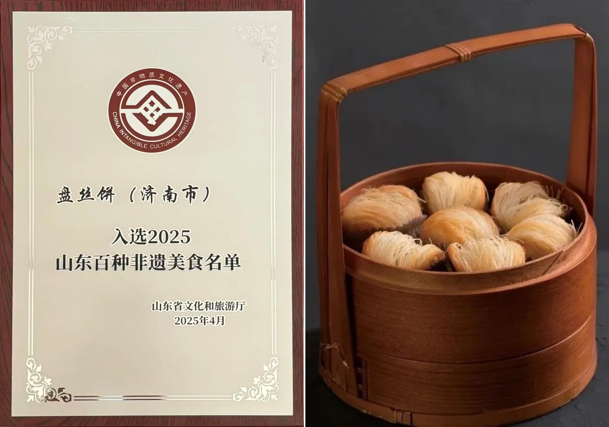 在山东省文化和旅游厅组织开展的“山东百种非遗美食”推荐活动中,山东文旅酒店集团泉城大酒店提报的“盘丝饼”,经广大市民与传统美食爱好者踊跃投票,成功“TOP出道”,入选2025山东百种非遗美食名单。