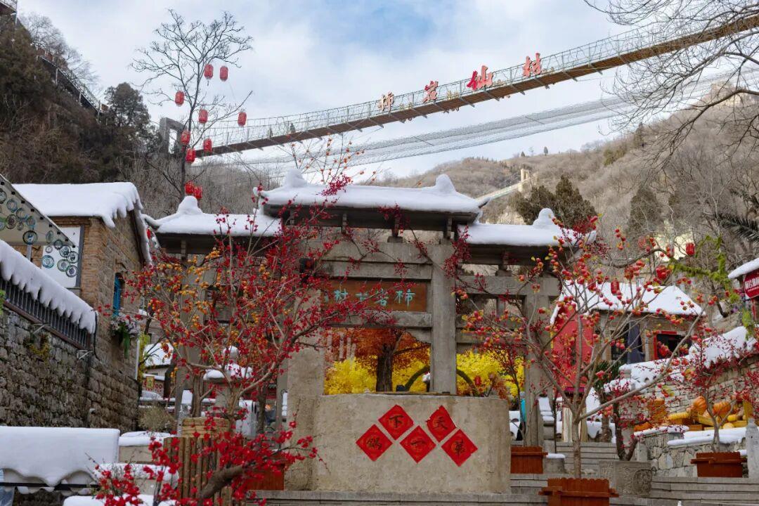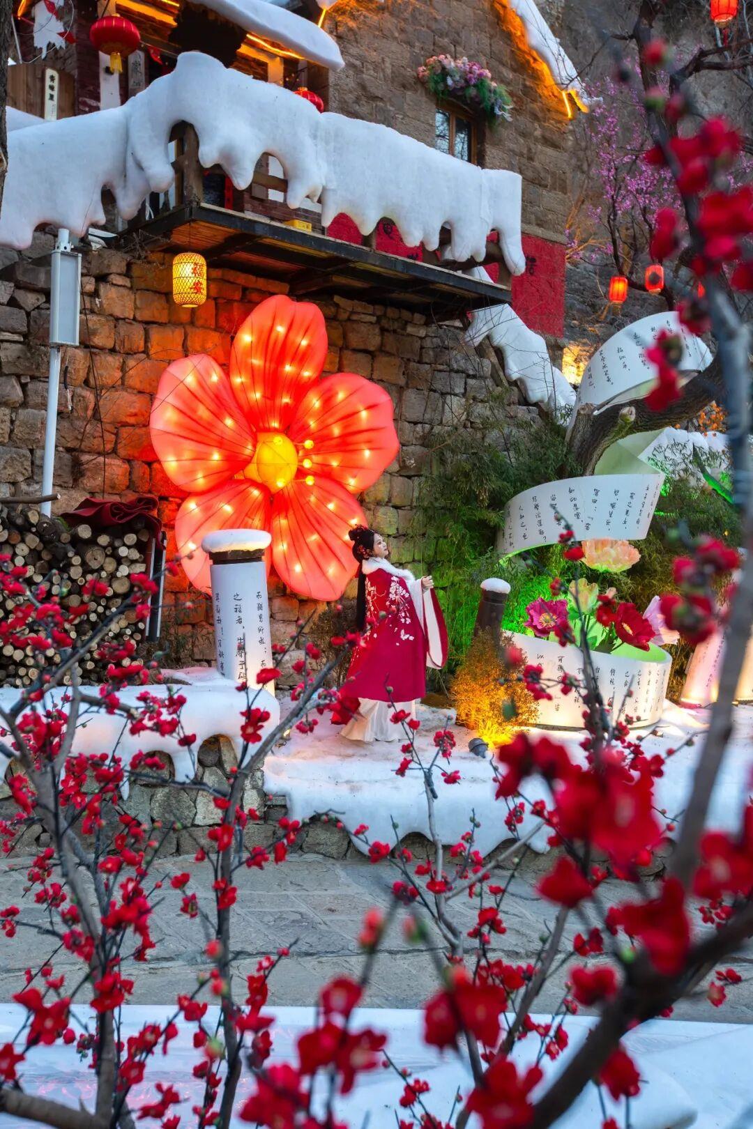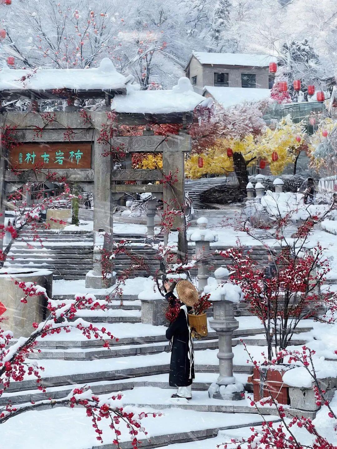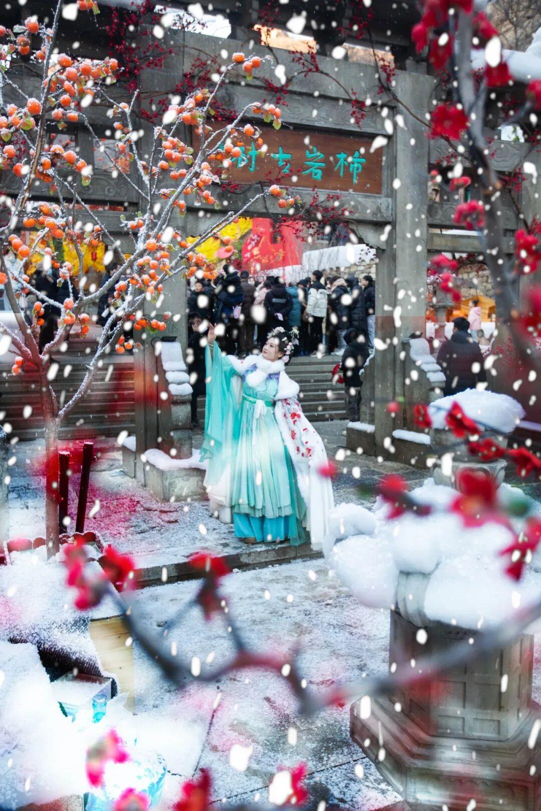 这个冬天,我们诚邀全国游客亲临现场,在“踏雪·寻梅记”的冬日盛景中,感受这份创新活力。雪覆古村,梅映柿岩,一幅冬日的诗意画卷正为您展开。您可漫步于红墙雪亭之间,观赏三十余种非遗杂艺;也可吃逛烟火柿岩村,品尝一元暖心的冬日小食,与穿越古今的NPC不期而遇。红叶柿岩以雪为幕,以梅为引,带您观赏兼具文化深度与生活温度的中式美学,体验一场穿越千年、温暖人心的冬日浪漫。