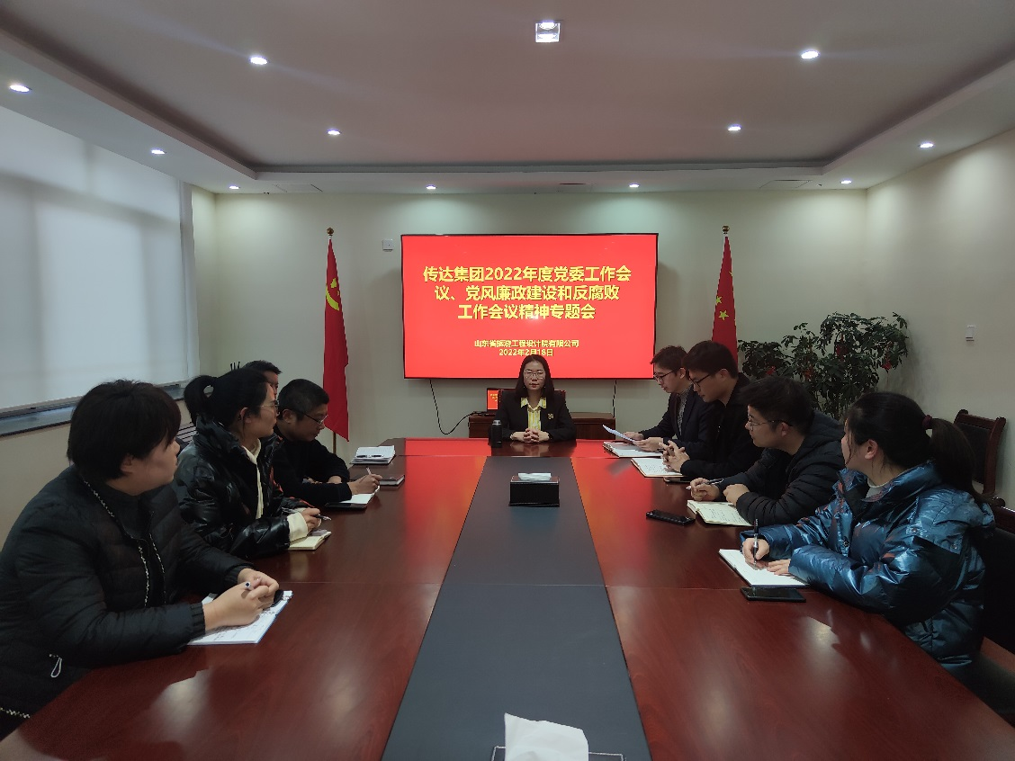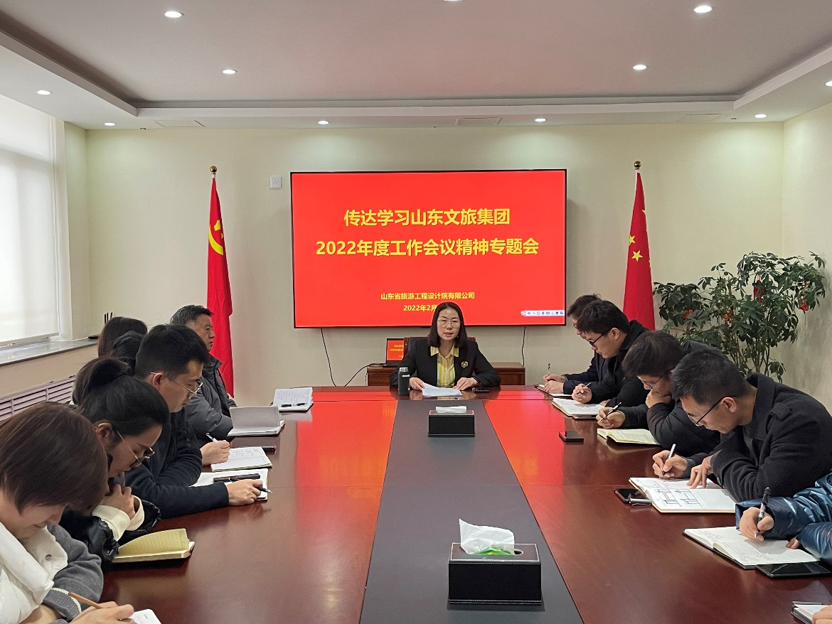 2月18日,山东省旅游工程设计院有限公司(简称“省旅游设计院”)组织召开专题会议,对山东文旅集团有限公司(以下简称“集团”)党委工作会议和年度工作会议精神进行传达学习,安排部署年度党建和经营工作。省旅游设计院党支部书记、执行董事孙晓静主持会议并讲话。