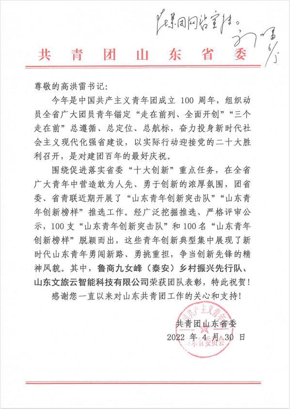 近日,山东文旅集团党委书记、董事长高洪雷收到团省委发来的贺信,祝贺集团直属单位山乡集团九女峰(泰安)乡村振兴先行队、山东文旅景区集团山东文旅云智能科技有限公司在团省委、省青联开展的“山东青年创新突击队”推选工作中,经过严格评审脱颖而出,获“山东青年创新突击队”荣誉称号。